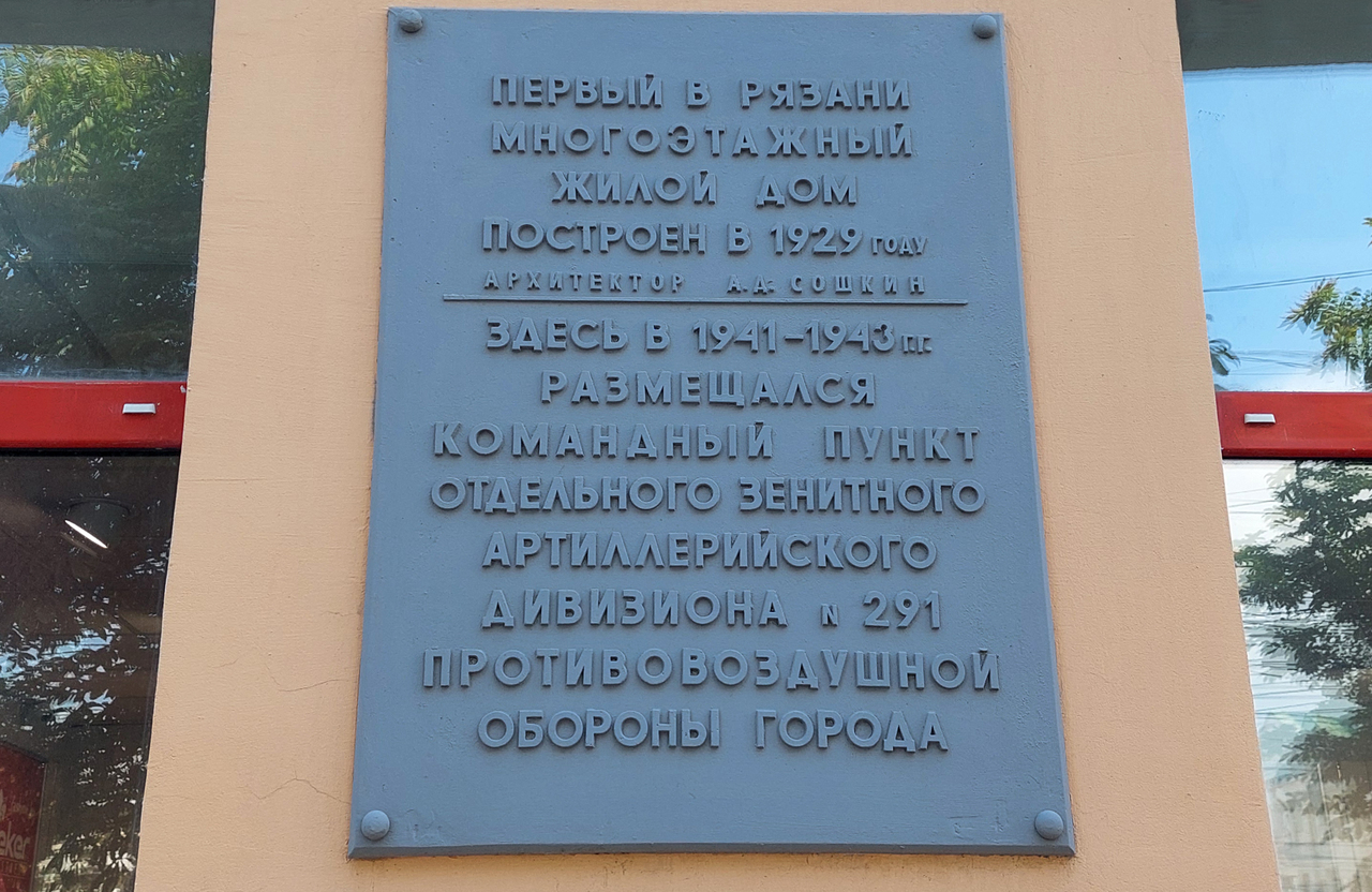Дом №13 по Первомайскому проспекту – первая высотка Рязани (построена в 1929 году). В 1941-1943 годах здесь размещался командный пункт отдельного зенитного артиллерийского дивизиона №291 противовоздушной обороны Рязани, который использовал доминирующее по высоте здание как наблюдательный пост. Прямо на крыше разместили и одно из орудий дивизиона.