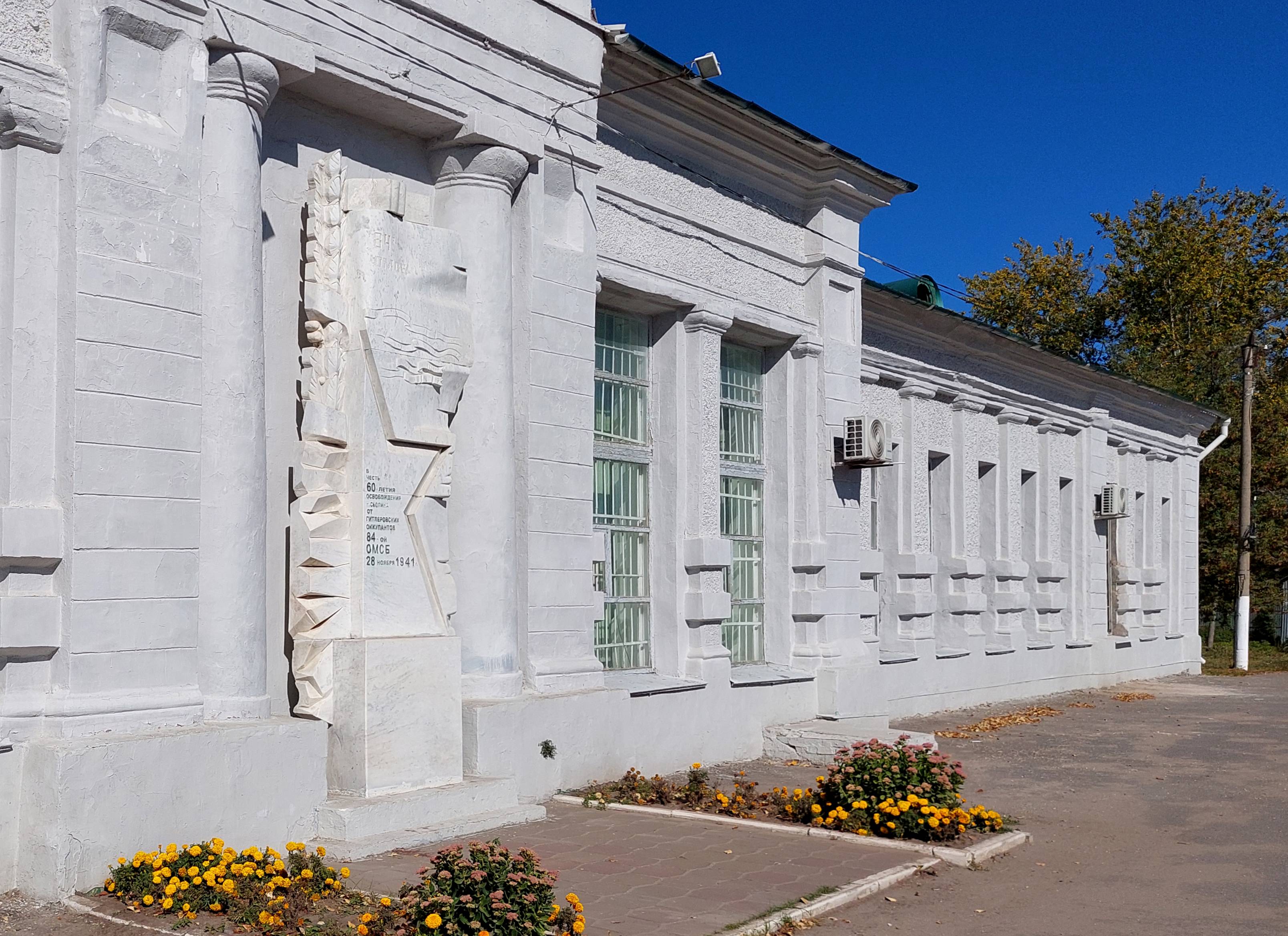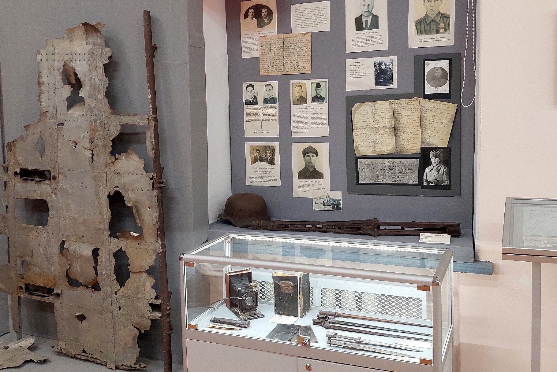 Зал воинской Славы – постоянная экспозиция музея. Здесь собраны артефакты, рассказывающие о ратном подвиге кораблинцев как на фронтах Великой Отечественной, так и в трудовом тылу. Нашла свое отражение и тема краткосрочного вторжения немецко-фашистских захватчиков на Кораблинскую землю. Особый интересе представляет фрагмент крыла советского бомбардировщика (предположительно ДБ-3Ф). Известно во время частичной оккупации Рязанской области в ноябре-декабря сорок первого на территории района совершил вынужденную посадку, а затем был уничтожен немцами советский бомбардировщик 1-го дальнего разведывательного авиаполка (летчик Митрофан Долганенко). Экипаж самолета взяли в плен, но вскоре летчики бежали. Еще один советский бомбардировщик был сбит в воздушном бою над территорией Кораблинского района. Экипаж похоронили на местном кладбище, но более подробно поговорим об этом на следующей точке. Фрагмент какого из двух самолетов представлен в музей доподлинно не известно.