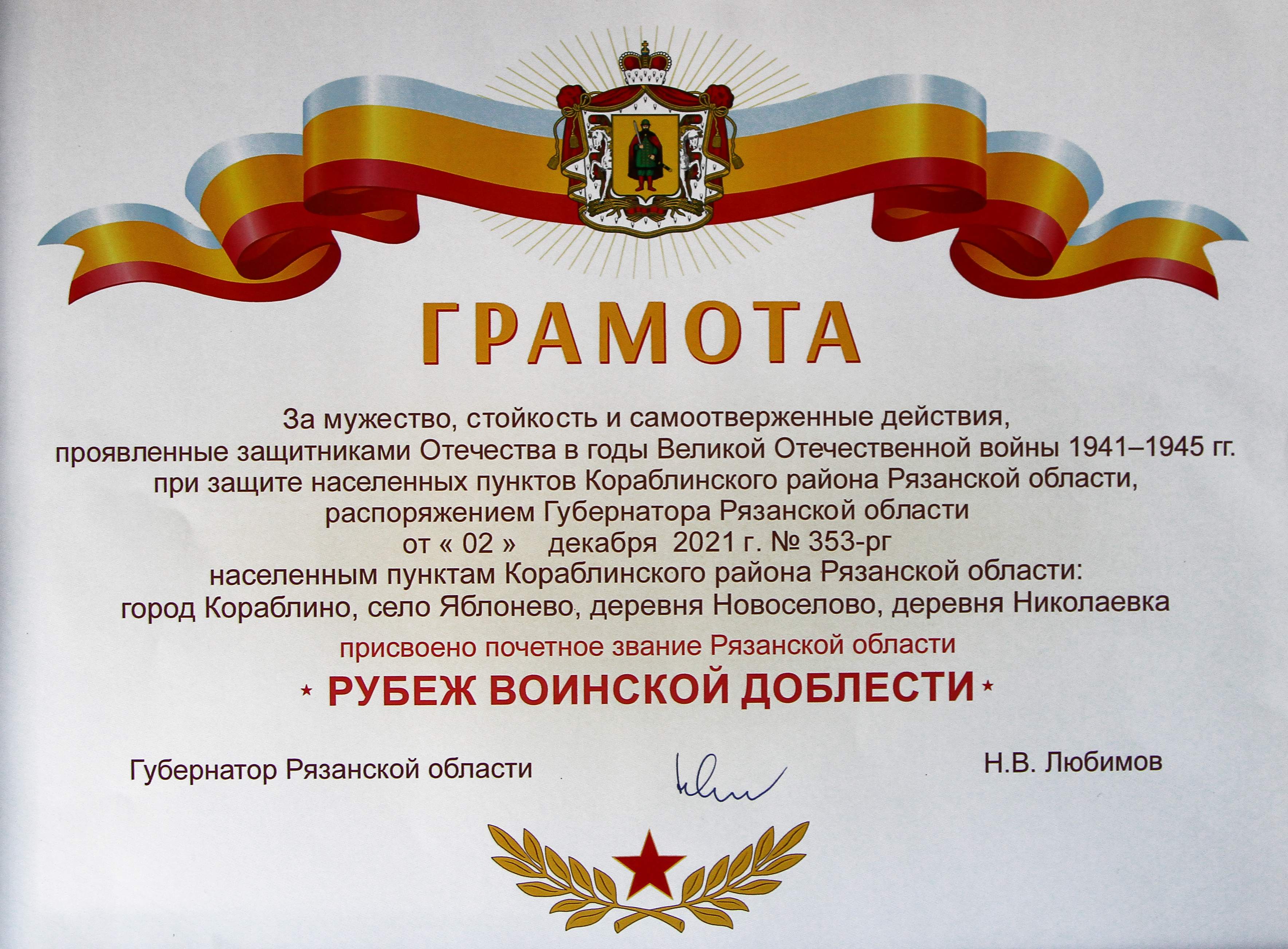 В декабре 2021 года распоряжением губернатора населенным пунктам Кораблинского района Николаевка – Кораблино – Новоселово – Яблонево присвоено почетное звание Рязанской области «Рубеж воинской доблести».